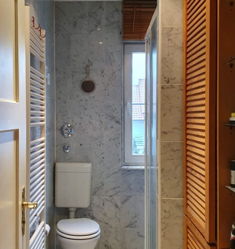 – kleineres Duschbad in Marmor mit Fenster, Waschbecken und WC