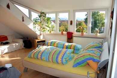 DG: lichtdurchflutetes, 2004 ausgebautes Studiozimmer mit verglaster Gaube und Blick in Giebel: traumhafte Aussichten auf Achalm und in die grüne Natur… * helles Duschbad mit WC u. Panoramafenster * begehbare Ankleide * heller Laminatboden *