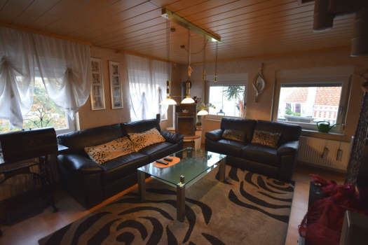 OG: Schönes Wohnzimmer (22 m²) mit gemütl. Kaminofen, viel Verglasung und direktem Zugang zum neuwertigen Wintergarten (14 m²) u. Freiluftbalkon – ideal zum Grillen – Relaxen od. Chillen * Schlafzimmer mit 11,6 m² * 2. Duschbad mit WC u. Waschb. *